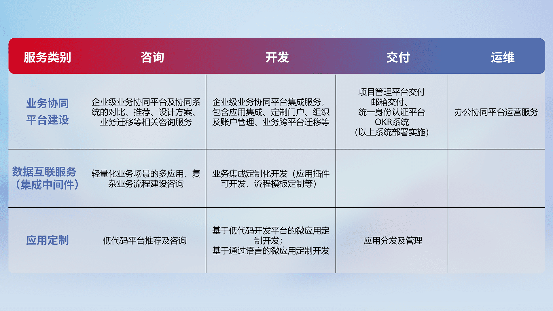 针对钉钉、、、企微、、、、IDaas等平台级产品提供产品的规划、、、、方案、、、、交付、、定制化开发等服务,,实现如统一协同办公、、智能客户服务、、混合会议管理、、智能数据查询、、、等业务场景,,实现数字化转型。。。