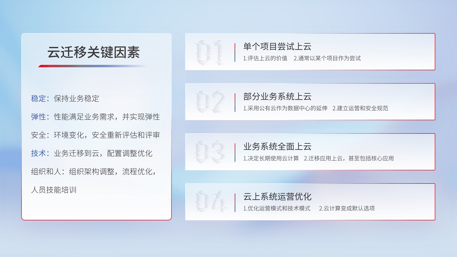 结合实际业务,,,从规划设计、、云平台选型、、云原生改造、、、数据迁移、、、、集成交付,,迁移全过程为客户识别最佳上云路径,,,做好风险识别管理,,,设计网络架构、、、、身份权限、、、安全审计合规、、、操作审计、、日志审计、、、、监控告警策略、、、、多站点容灾设计等,,,,对云上基础设施进行整体规划,,提升IT治理水平,,以满足弹性、、高可用、、、高性能的需求。。