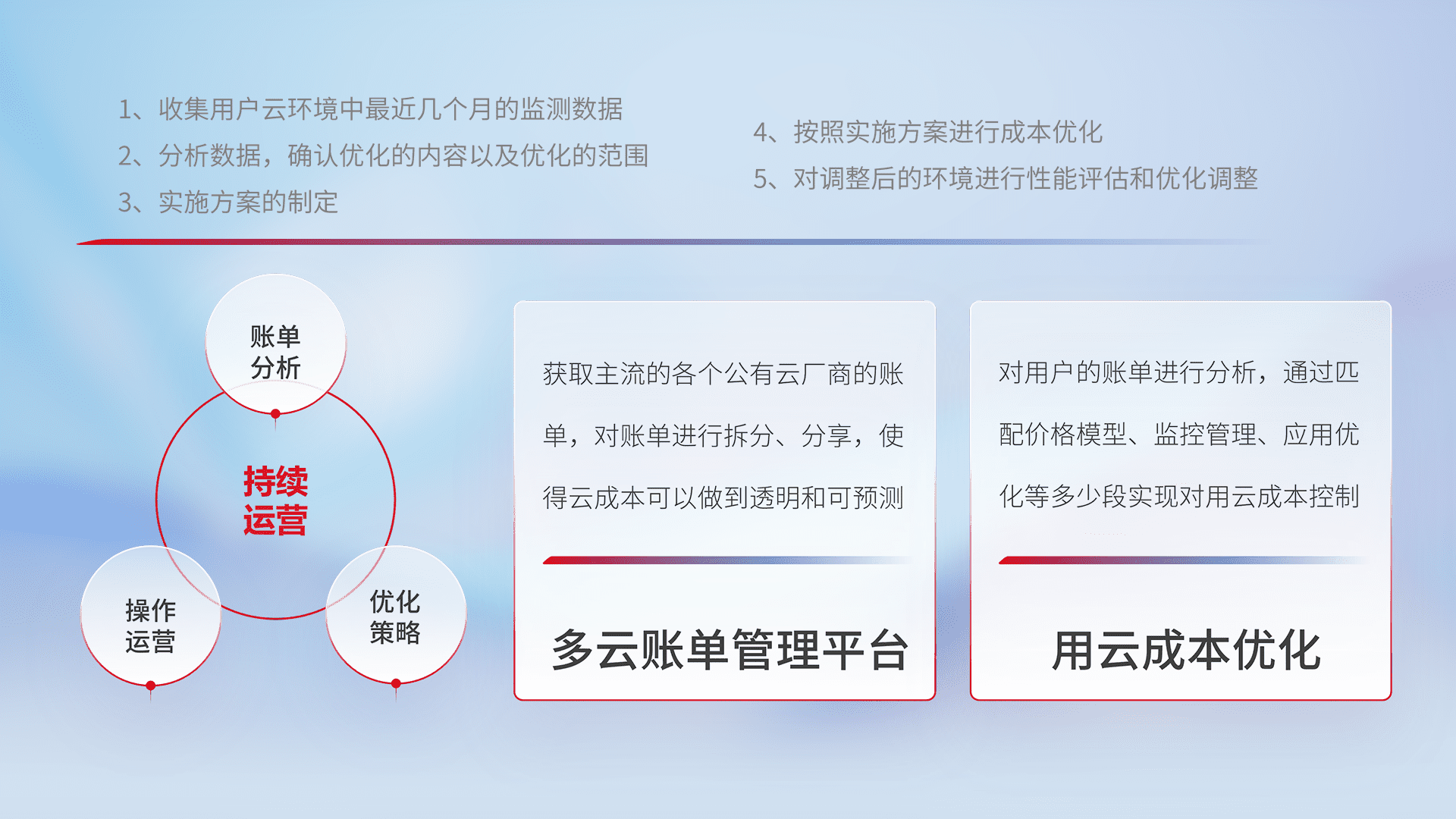 通过多云纳管,,以统一的资源数据模型把客户的云资源进行抽象和封装,,进而实现对多云资源的统一操作,,保障云资源管理的可靠性、、、稳定性与可用性。。量身定制化运维内容,,,,配置、、、、开发运维、、、、补丁管理、、、、备份、、监控、、认证和访问管理、、、、审计和日常巡检等,,,保障在用云过程中的可靠度,,,稳定度以及高可用率。。。。